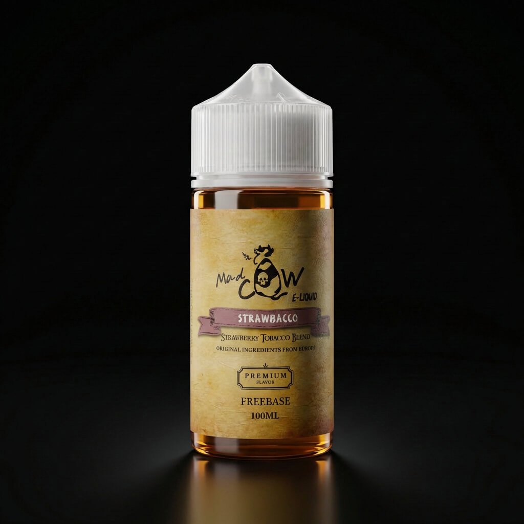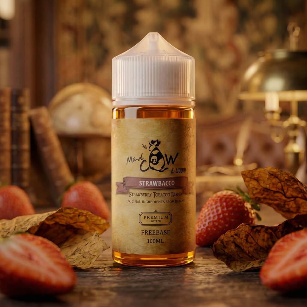 Strawbacco by Madcow Eliquid น้ำยาบุหรี่ไฟฟ้ากลิ่น Strawberry Tobacco Blend ผสานความหวานนุ่มของสตรอว์เบอร์รี่กับกลิ่นยาสูบโทน Tobacco อย่างลงตัว ให้ฟีลหอมละมุน นุ่มลึก ไม่เลี่ยน เหมาะสำหรับสายหวานผสมสายดาร์กที่ต้องการความบาลานซ์ระดับพรีเมียม
